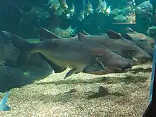 Mekong giant catfish are one of the largest species of freshwater fish. In 2005, the Mekong giant catfish attained the Guinness World Record for the world's largest freshwater fish.[4][5] Attaining a length of up to 3 m (9.8 ft), the Mekong giant catfish grows extremely quickly, reaching a mass of 150 to 200 kg (330 to 440 lb) in only six years.[3] It can reportedly weigh up to 350 kg (770 lb).[3] The largest catch recorded in Thailand since record-keeping began in 1981 was a female measuring 2.7 m (8 ft 10 in) in length and weighing 293 kg (646 lb). This specimen, caught in 2005, was widely recognized as the largest entirely freshwater fish ever caught (the largest sturgeon species can far exceed this size, but they are anadromous), until surpassed in June of 2022 by a giant freshwater stingray specimen caught in Cambodia.[6] Thai fisheries officials stripped the giant catfish, caught in 2005, of its eggs as part of a breeding program, intending then to release it, but the fish died in captivity and was sold as food to local villagers.[5][7][8]