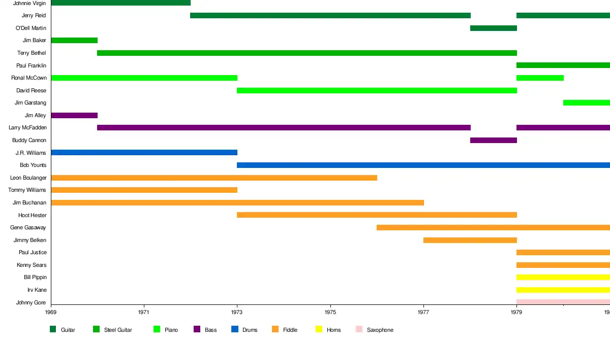 The Statesiders were Mel's longtime backing band. They were named after his 1966 hit single "Stateside". Between 1969 and 1980 14 studio albums and 4 live albums were released credited to Mel Tillis and the Statesiders, and the Statesiders released one studio album on their own in 1975. Several notable musicians have served as Statesiders, such as Buddy Cannon, Paul Franklin, Hoot Hester, and Jimmy Belken of the Strangers. While many other members have played with them during their run from 1967 to 2017, below is a timeline of just the members during their recorded output.