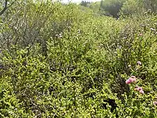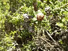 The flowers are a shade of pink to purple and arranged in heads on the ends of branches which continue to grow after flowering, sometimes also in the upper leaf axils. The heads are up to 20 mm (0.8 in) in diameter and contain between 7 and 20 individual flowers. The stamens are arranged in bundles of five around the flower, with 5 to 10 stamens in each bundle. The flowering season is spring and is followed by fruit which are woody capsules, 3–3.5 mm (0.12–0.14 in) long in irregular clusters along the stems.[2][3]