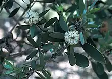 The flowers are white or cream, sometimes pinkish and arranged in heads on the ends of branches which continue to grow after flowering and in the upper leaf axils. The heads are up to 18 mm (0.7 in) in diameter and contain between 5 and 11 groups of flowers in threes. The stamens are arranged in 5 bundles around the flowers and each bundle contains 6 to 9 stamens. Flowering occurs unpredictably throughout the year and is followed by fruit which are woody capsules 2.5–4 mm (0.1–0.2 in) long, arranged in cylindrical spikes. The seeds are released within a year when the fruits are mature.[2][3]