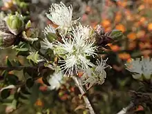 The flowers are white or cream-coloured and occur singly or in small groups, sometimes at the ends of branches and sometimes in the leaf axils. At the base of each flower there are brown, papery, overlapping bracts. The stamens are arranged in 5 bundles around the flower, each bundle containing 22 to 25 stamens. Flowering occurs from July to October but mostly in September. The fruit are woody capsules 5–5.9 mm (0.20–0.23 in) long with the sepals remaining as long curved teeth.[2][3]