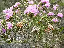 The flowers are a shade of pink to purple and are arranged in heads on the ends of branches which continue to grow after flowering, sometimes also in the upper leaf axils. The heads are up to 18 mm (0.7 in) in diameter and contain 5 to 12 groups of flowers in threes. The petals are 0.7–1.5 mm (0.03–0.06 in) long and fall off as the flower ages. The stamens are arranged in bundles of five around the flower, usually with 4 to 6 stamens in each bundle. The flowering season is mainly in spring but has been recorded as early as April. The fruit are woody capsules, 2–3 mm (0.08–0.1 in) long forming roughly spherical clusters around the stem.[2][3]