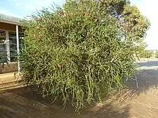 Melaleuca coccinea, commonly known as the goldfields bottlebrush is a shrub in the myrtle family Myrtaceae and is endemic the south of Western Australia. It is distinguished by its unusual foliage and bottlebrush spikes of red flowers.