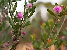 The flowers are a shade of pink to purple and are arranged in heads or spikes usually only on the sides of the branches. The spikes are up to 15 mm (0.6 in) in diameter and composed of 5 to 12 groups of flowers in threes. The outer edge of the floral cup and the parts of the flowers covering the buds are covered with short, soft, silky white hairs. The petals are 1.2–1.8 mm (0.05–0.07 in) long and fall off as the flower ages. There are five bundles of stamens around the flower, each with 4 to 7 stamens. Flowering occurs in spring and early summer and is followed by fruit which are woody capsules 2.5–3.5 mm (0.098–0.14 in) long, in almost spherical clusters along the stem.[2][3]