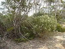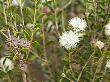 The flowers are white or cream-coloured and arranged in heads or short spikes on the ends of branches which continue to grow after flowering and sometimes in the upper leaf axils. The heads are up to 23 mm (0.9 in) in diameter and composed of 2 to 12 groups of flowers in threes. The petals are 2–3 mm (0.08–0.1 in) long and fall off as the flower ages. There are five bundles of stamens around the flower, each with 5 to 8 stamens. Flowering occurs between September and January and is followed by fruit which are woody capsules, usually 3–4 mm (0.12–0.16 in) long, in oval-shaped clusters around the stem.[2][3]