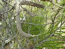 The flowers are white, cream-coloured or a shade of pink and arranged in spikes on the ends of branches which continue to grow after flowering and sometimes also in the upper leaf axils. The spikes are up to 100 mm (4 in) long and sometimes longer, up to 25 mm (1 in) in diameter and contain up to 140 groups of flowers in threes. The petals are 1.5–3 mm (0.06–0.1 in) long and fall off as the flowers age. The stamens are arranged in bundles of five around the flower, with 6 to 13 stamens in each bundle. Flowering occurs between August and January and is followed by fruit which are woody, cup-shaped capsules 2.3–2.8 mm (0.09–0.1 in) long and wide in clusters along the stem.[2][3]