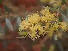 The flowers are yellowish green or white, and are arranged in heads at the ends of branches which continue to grow after flowering, as well as in the upper leaf axils. Each head contains between 2 and 11 groups of flowers in threes and is up to 22 millimetres (0.87 in) in diameter. The stamens are arranged in five bundles around the flower, each bundle containing 6 to 20 stamens which have hairy stalks. Flowering occurs intermittently throughout the year but mostly in winter. The fruit which follow are woody capsules with the sepals forming teeth at first but are eroded later to undulations around the edge of the cup-shaped capsules. The capsules are 2–3 millimetres (0.079–0.118 in) long and form loose clusters along the branches.[2][3]