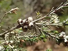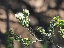 The flowers are cream to white, sometimes pinkish and arranged in heads on the ends of branches which continue to grow after flowering. The heads are up to 15 mm (0.6 in) in diameter with 3 to 18 individual flowers. The petals are 1.3–2 mm (0.05–0.08 in) long and fall off as the flower matures. There are five bundles of stamens around the flower, each with 7 to 11 stamens. Flowering occurs from September to November, and is followed by fruit which are woody, cup-shaped capsules, 1.8–2 mm (0.07–0.08 in) long in clusters along the stem.[2][3]