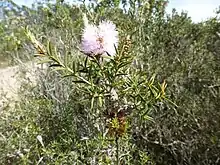 The flowers are a shade of pink or mauve, and arranged in heads at the ends of branches which continue to grow after flowering and sometimes also in the upper leaf axils. The heads are up to 17 mm (0.7 in) in diameter, 40 mm (2 in) long and contain up to four groups of flowers in threes. The stamens are arranged in five bundles around the flower, each bundle with 7 to 13 stamens. Flowering occurs from August to February but mainly in early summer. The fruit which follow are woody capsules 3.5–4 mm (0.14–0.16 in) long in oval or oblong clusters up to 10 mm (0.4 in) in diameter and 25 mm (1 in) long.[2][3]
