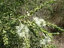 Flowers appear in summer in cream or white cylindrical "bottlebrush" spikes which are 2 to 5 cm (0.8 to 2 in) long and 1 to 2 cm (0.4 to 0.8 in) in diameter. Often new growth appears at the end of the spikes.[3] Following flowering, grey-brown, woody capsules appear in clusters along the branchlets. These are ovoid, stalkless and 3 to 4 mm (0.1 to 0.2 in) in diameter [3]