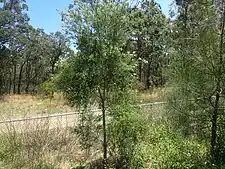 It is a small to medium-sized tree up to 20 m (70 ft) high with a dense, rounded canopy and drooping branchlets.[2][3] The spongy bark is white or light brown and peels off in large strips.[3] The leaves are sessile, 7–15 mm (0.3–0.6 in) long and 2.5–6 mm (0.1–0.2 in) wide.[2] They are slightly twisted, have sharply-pointed tips, are arranged alternately on the branchlets and have between 15 and 30 veins.[3][4]