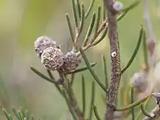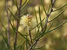 The flowers are cream coloured to bright yellow and are arranged in heads on the ends of branches which continue to grow after flowering and sometimes also in the upper leaf axils. The heads are up to 18 mm (0.7 in) in diameter with 2 to 13 groups of flowers in threes. The petals are 1.0–2.2 mm (0.04–0.09 in) long and fall off as the flower matures. The outer surface of the floral cup (the hypanthium) is hairy and there are five bundles of stamens around the flower, each with 6 to 8 stamens. Flowering occurs mainly in spring and is followed by fruit which are woody capsules, 2.0–2.5 mm (0.08–0.1 in) long, packed tightly together in spherical or oblong clusters.[2][3]