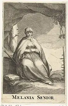 Melania the Elder, Latin Melania Maior (born in Spain, ca. 350[1] - died in Jerusalem before 410[2][1] or in ca. 417[3]) was a Desert Mother who was an influential figure in the Christian ascetic movement (the Desert Fathers and Mothers) that sprang up in the generation after the Emperor Constantine made Christianity a legal religion of the Roman Empire. She was a contemporary of, and well known to, Abba Macarius and other Desert Fathers in Egypt, Jerome, Augustine of Hippo, Paulinus of Nola (her cousin or cousin-in-law; he gives a colorful description of her visit to Nola in his Letters), and Evagrius of Pontus, and she founded two religious communities on the Mount of Olives in Jerusalem.[4][1] She stands out for the convent she founded for herself and the monastery she established in honour of Rufinus of Aquileia, which belongs to the earliest Christian communities, and because she promoted the asceticism which she, as a follower of Origen, considered indispensable for salvation.[1]