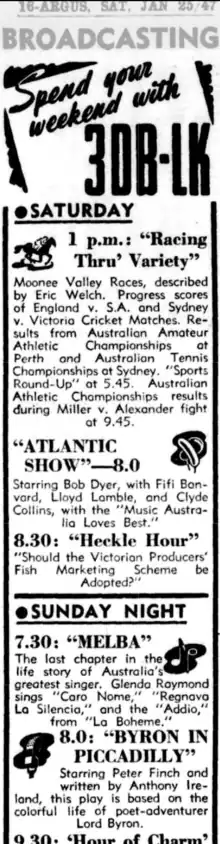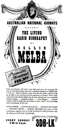 - ↑ Australian Broadcasting Commission. (1939), "National Programme News: Melba's Life as Dramatic Serial", ABC Weekly, Sydney: ABC (Vol. 8 No. 4 (9 February 1946)), nla.obj-1331741430, retrieved 14 December 2023 – via Trove