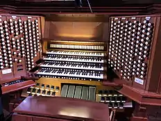 The organ was originally built by Hill & son (of England) in 1872 before a fire destroyed it in 1925.[12] A new organ constructed by Hill Norman & Beard was installed in 1929 and has since then been rebuilt and enlarged by Schantz Organ Company of the United States of America from 1995 to 2001 at a cost of $4.5 million.[19] The rebuild included 2 new floating divisions (Fanfare & Bombarde), many new voices and a secondary moveable console