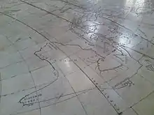 Photo of the marble floor inlaid into the Amsterdam Town Hall showing Nova Hollandia and Terra Dimensis – the inlayer incorrectly connected the two, while the original Blaeu map shows the gap.