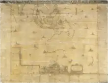 The map by Thévenot, Hollandia NovaTerre Australe in the Relation de Divers Voyages..., is a French version of the 1644 chart of Abel Tasman's discoveries using information from Dutch sources, notably Joan Blaeu's world map published in 1659.[5] Although Thévenot said that he had taken his chart from the one inlaid into the floor of the Amsterdam Town Hall, in fact it appears to be an almost exact copy of that of Joan Blaeu in his Archipelagus Orientalis sive Asiaticus published in 1659 in the Kurfürsten Atlas (“Atlas of the Great Elector“).[6] The map of the world set into the floor of the great hall of the Amsterdam Town Hall was drawn from Blaeu's world map of 1648. Once Blaeu's map of the world appeared other mapmakers, such as Thévenot, copied his depiction of New Holland. Hollandia Nova in the Kurfürsten Atlas is shown as it appears in Blaeu's world map of 1648, Nova et Accuratissima Terrarum Orbis Tabula.[7] Thévenot divided the continent in two, between Nova Hollandia to the west and Terre Australe to the east of a latitude staff running down the meridian equivalent to longitude 135 degrees East of Greenwich.[8] The differentiation between Nova Hollandia to the west and Terre Australe to the east of the meridian corresponding to 135° East of Greenwich, emphasized by the latitude staff running down that meridian, appears to have been an initiative of Thevenot's, as there is no such division on Blaeu's map or on the Amsterdam Town Hall map.[9] This apparent division may have been fortuitous, as on other Dutch maps of this period Terra Australis or t'Zuid Landt ("the South Land") appears with the name, Hollandia Nova as an alternative name for the whole country.[10] The meridian staff dividing Nova Hollandia from Terre Australe on Thévenot's map fell along the meridian that represented the western limit of Spain's imperial claim in the South Pacific arising from the Treaty of Tordesillas of 1494 and act of possession of the South Land made by Pedro Fernández de Quirós in 1606. This western limit of Spain's claim is shown on the 1761 map of the Spanish Empire by Vicente de Memije, Aspecto Symbolico del Mundo Hispanico.[11]