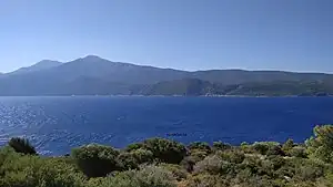 Mount Mycale, or the Samsun Range, seen from Samos across the straits. The north is to the left. The whole thing was part of Melian territory. The main question about the location of Melia is whether it was at Fort Karion on the lower slopes or at Çatallar Tepe on the upper slopes.