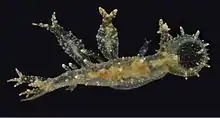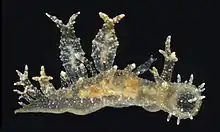 The cerata are mainly warty in appearance due to complete coverage of small tubercules. They are oval and are inflated with their distal ends being bifurcate or trifurcate, or, simple. Within the cerata, the branches of the digestive gland are visible due to the cerata being transparent. This gland appears as an axis brownish in colour.[5][6]