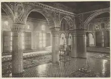 Most of the synagogues in the Mellah were merely pre-existing rooms within private residences which were converted by the owners into places of worship and sustained by member donations. As a result, almost everyone lived within a few steps of a synagogue, but very few synagogues were supported through public funding.[6] A few of them, however, were larger and were decorated with zellij mosaic tiles, carved stucco, and painted wooden ceilings, typically using much of the same decorative repertoires as Islamic architecture elsewhere in the city.[6][9]