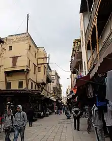 Bab el-Mellah originally had a bent entrance but now has a straight passage.[1] Despite this modification, the area near it is believed to be the oldest part of the Mellah.[6] Just south of the gate, inside the boundary of the Mellah, is the Slat al-Fassiyin Synagogue, believed to be the oldest synagogue of the district.[6] West of Bab el-Mellah, the main street from Bab Semmarine continues in a roughly straight line towards the southwest. This street constituted the main street and souq (market) of the Mellah, and was thus also called Derb al-Souq ("Street of the Market"). The street may have been much wider originally and featured a large market square, but over time it was steadily encroached upon by the construction of shops and houses.[6] The street's western end is very narrow and was once a cul-de-sac, but it was opened up after 1912 when the French created the open square called Place du Commerce behind Bab al-Amer, thus allowing pedestrians today to enter the Mellah from the west side as well.[8] The main market street also marks a rough division between the "Upper" and "Lower" Mellah.[1]