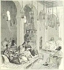 Both the exact reasons and the exact date for the creation of the Jewish Mellah of Fez are not firmly established.[13][4] Historical accounts confirm that in the mid-14th century the Jews of Fez were still living in Fes el-Bali but that by the end of the 16th century they were well-established in the Mellah of Fes el-Jdid.[1] Moroccan scholar Hicham Rguig, for example, states that the transfer is not precisely dated and argues that it likely happened in stages across the Marinid period (late 13th to 15th centuries), particularly following episodes of violence or repression against Jews in the old city.[4] One of the earliest such instances of violence was a revolt in 1276 against the new Marinid dynasty, right before Sultan Abu Yusuf Ya'qub decided to found Fes el-Jdid. The revolt shook the whole city but also resulted in much violence against the Jewish inhabitants, which may have incited Abu Yusuf Ya'qub to intervene in some way to protect the community.[4] Susan Gilson Miller, a scholar of Moroccan and Jewish history, has also noted that the urban fabric of the Mellah appears to have developed progressively and it's thus possible that a small Jewish population settled here right after the foundation of Fes el-Jdid and that other Jews fleeing the old city joined them later.[6] Many authors, citing historical Jewish chronicles, attribute the main transfer more specifically to the "rediscovery" of Idris II's body in his old mosque at the center of the city in 1437.[6][10][14][15][13] The area around the mosque, located in the middle of the city's main commercial districts, was turned into a horm (sanctuary) where non-Muslims were not allowed to enter, resulting in the expulsion of the Jewish inhabitants and merchants there.[4] At least several authors claim that the expulsion was further enforced to all of Fes el-Bali because it was given the status of a "holy" city as a result of the discovery.[6][15][13][16] Other scholars also date the move generally to the mid-15th century, without arguing for a specific date.[2][5] In any case, the transfer (whether progressive or sudden) occurred with some violence and hardship.[6] Many Jewish households chose to convert (at least officially) rather than leave their homes and their businesses in the heart of the old city, resulting in a growing group referred to as al-Bildiyyin (Muslim families of Jewish origin, often retaining Jewish surnames).[5][13]
