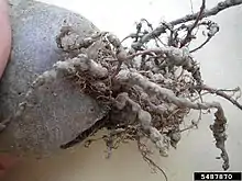 Root symptoms are similar to those caused by all nematodes including a reduction in number of feeder roots and root stunting, but root knot nematodes cause unique symptoms on roots and pods. Nematodes cause galls (knots) to form on both roots and pods of the peanut, and these galls are highly diagnostic for root-knot nematode presence compared to other nematodes affecting peanut. The presence of galls on roots, pegs and pods appears as single or multiple wart-like growths that may or may not be discolored. As root knot nematode infection progresses, and generally later in the season, secondary root and pod rots cause further damage and eventual death of the plants.[9]