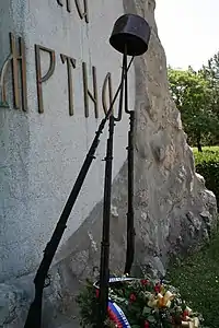 In front of the monument is a composition, which consists of three rifles with bayonets, leaning against each other, with a šajkača on top of the bayonet. At the top of the monument is a bronze figure of an eagle with outstretched wings, holding a laurel wreath in its beak. Rifles with shajkacs and an eagle with a laurel wreath have a common symbolism – marking the battle that ended with the Serbian victory. The rifles are no longer in action, so they are covered by the winner's hat, and the eagle, additionally symbolizing victory in the whole war, wears a wreath as a sign of victory, while its outstretched wings symbolize the won freedom.