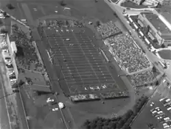 Memorial Stadium was a multi-purpose stadium in Kent, Ohio, United States, on the campus of Kent State University. Its primary use was as the home field for the Kent State Golden Flashes football team and also served as the home venue for the KSU men's track and field team. The football and track teams had already been playing on the site since 1941, but with temporary bleachers for seating. The permanent grandstand built and dedicated in 1950, which also included a press box, was the first phase of the stadium, and was later followed by a duplicate grandstand on the opposite side of the field in 1954. Initial plans called for the seating to eventually surround the field, though these plans were largely never realized. During the 1960s, additional bleacher seats were added separate from the two main grandstands on all sides of the field, and brought seating capacity to approximately 20,000 by 1965.