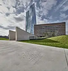 Memorial at the Frankfurt Grossmarkthalle. The building of the former Grossmarkthalle with the new building of the European Central Bank can be seen in the Background.