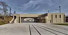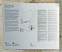 The memorial was designed by the architect office KatzKaiser from Cologne and Darmstadt. The concept relies on the unobtrusiveness of its elements: selected quotations from murdered Frankfurt citizens, from survivors of the Holocaust and from observers of mass deportations. It is based on the preserving the surviving fragments from the time of the deportations (cellar, ramp space, signal box, footbridge, tracks) in their found state and linking them with each other via new components, such as a concrete path. A ramp structure provides the connection to the basement of the Grossmarkthalle, which today lies on the extraterritorial site of the European Central Bank. In this location, the Jewish women, men and children were detained, mistreated and robbed of their last belongings, before being forcibly deported by trains of the Deutsche Reichsbahn.[1]