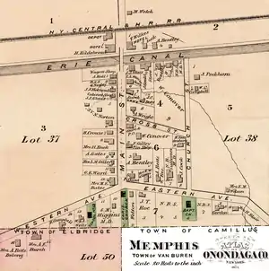Because of its location on the southern town line of Van Buren, above the Towns of Elbridge and Camillus, the Memphis area can also be considered to extend into Elbridge and Camillus. A section of Memphis lies on Cross Lake and Seneca River.