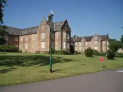 The main two-storey building, with attics, has a frontage in an "E" shape which is 280 metres (920 ft) long. The roofs are covered in slate and have ogee-shaped gables and finials, with stone chimney stacks.[1] The stone chapel, which is joined to the main building by a covered walkway, is supported by two-stage buttresses and has a spire on the crossing tower.[2] There is also a lodge at the entrance to the site.[3]