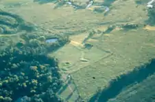 The Menoken Site occupies a terrace on the south side of Apple Creek, a tributary of the Missouri River, to which it flows near Bismarck. The site consists of a defensive earthworks, whose major component is a ditch about 245 metres (804 ft) in length, with four bastion loops projecting outward at equally spaced intervals. The ditch is about 1.5 metres (4.9 ft) deep, and varies in width from 6 to 7 metres (20 to 23 ft) in width. The ditch forms a curve, covering about 100° of a circle, and protects an inner area of about 1.5 acres (0.61 ha). Archaeological evidence indicates that there was originally a palisade just inside the ditch; only post holes of this structure survive. The inner area of the fortification, which has not been fully investigated, is estimated to have had between 11 and 13 semi-subterranean residential structures in it.[3]