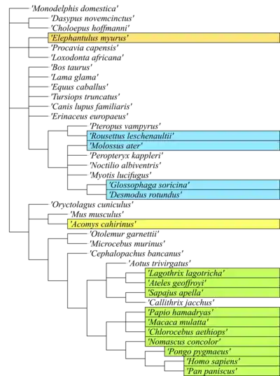 Phylogeny tree of menstruating and select non-menstruating mammals. Each color indicates a convergent evolutionary event: green, Primates; blue, Chiroptera; orange, Afrotheria; yellow, Rodentia.[21][26][27]