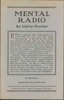 Mental Radio: Does it work, and how? (1930) was written by the American author Upton Sinclair and initially self-published. This book documents Sinclair's test of psychic abilities of Mary Craig Sinclair, his second wife, while she was in a state of profound depression with a heightened interest in the occult. She attempted to duplicate 290 pictures which were drawn by her brother. Sinclair claimed Mary successfully duplicated 65 of them, with 155 "partial successes" and 70 failures. In spite of the author's best efforts, the experiments were not conducted in a controlled scientific environment.[1]