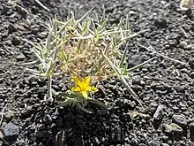 The inflorescence is a cluster of flowers each with yellow petals up to 1.5 centimeters long and many whiskery stamens each up to a centimeter in length. The fruit is an urn-shaped utricle containing many tiny bullet-shaped seeds.