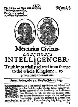 Published in London, each number of the Mercurius Civicus consisted of one quarto sheet folded to make up four leaves, and was priced at one penny. Beginning with the third issue, the front page was usually illustrated with one or two woodcuts, usually of some political or military leader’s portrait (although the same cut was often used for different persons), making it the first illustrated journal.[1] It is regarded as the "first big city newspaper"[2]