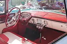 The model line underwent a revision, as the Montclair four-door pillared sedan now shared its roofline with the Monterey. Alongside the two-door hardtop, a four-door hardtop was introduced, with both versions now designated as Montclair Phaetons; a Montclair convertible was offered.[13][14][15][16] The 312 V8 was carried over from 1956, retuned to 255 hp.[17] From the Turnpike Cruiser, the 368 cubic-inch V8 was offered as an option, producing 290 hp.[17] A three speed manual transmission was standard, while the optional 3-speed automatic adopted pushbutton shift controls that was not related to the ill-fated electric solenoid controlled Teletouch used by Edsel. Mercury offered mechanically activated pushbutton transmission controls in response to the Chrysler TorqueFlite pushbutton controls introduced in 1956. The Mercury control buttons initially offered five buttons and was called "Keyboard Control", with a long button on top labeled "Drive" with four smaller buttons below labeled "Brake", "Neutral Start" which would allow the engine to start with the ignition key, "Hill Control" and "Reverse" with later versions separating the "Drive" button to "Performance" and "Cruising" for 1958 and relabeled as "Multi-Drive". A separate push/pull lever was included below the control buttons labeled "Park" which would lock out the control buttons until the Park button was pulled to release it. The control panel was installed to the left of the steering wheel. In 1959 the keyboard control was discontinued in favor of a standard steering column mounted gear selector lever.[17][18][19]