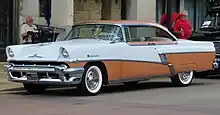 For 1955, Mercury redesigned its model line, adding the Montclair as a premium sedan line above the Monterey.[3] Alongside a four-door sedan (sharing a different roofline from the Monterey), the Montclair was introduced in a two-door hardtop and two-door convertible configuration.[4] As a styling feature, the Montclair received a color-contrast panel below the window line (typically color-coordinated with the roof).[3] A 292 cubic-inch V8 adopted from the new Ford Thunderbird roadster produced 195 hp; along with a 3-speed manual transmission, a 3-speed automatic was offered as an option.[5][1] The listed retail price for the 1955 2-door Hardtop Coupe was US$2,631 ($28,742 in 2022 dollars [6]) and sold 71,588. Standard equipment included cloth and vinyl upholstery, full interior carpeting, and chrome window surround mouldings; among the options were a heater and windshield defroster, radio, power adjustable front seat, power windows, power steering, power brakes and auxiliary road lamps.[1]