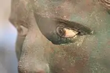 The Meroë Head is larger than life-size and mimics Greek art by portraying Augustus with classical proportions; it was clearly designed to idealize and flatter the Emperor.[14] This was the case for most Augustan portraiture, especially the earliest, which evoked both youthfulness and the long-admired Grecian techniques of depicting young men.[14][9] Made of bronze, the eyes are inset with glass pupils and calcite irises. It is the preservation of the eyes (which are frequently lost in ancient bronze statues) which makes this statue so startlingly realistic. The emperor's head turns to his right and gazes powerfully into the distance. His hair falls onto his brow in waves that are typical of Augustus's portraits.[10] The three locks of hair consisting of two parted at the center and a third on the right approximate those of Prima Porta type.[15] The British Museum has several other notable bronze heads of Roman Emperors including an image of Claudius. The heads are thought to have been made locally but based on moulds created in Rome.[10]