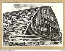 In 1942 the Military took over the Atherton Showground and remained there for three years. In November 1943 a large igloo was erected for the Army by the Queensland Building and Engineering Co., under the auspices of the Allied Works Council. It was 200 by 100 feet (61 by 30 m) in size and built particularly to house the "Daily Issue Department", or Australian Defence canteen. A bakery, which daily supplied bread for all the forces in the area, was built on the western side of the show ring. The canteen igloo was constructed with a nailed hardwood timber arch construction, each arm made up of two half arches, pinned at two supports near the ground and at a central point. It formed an arch with timber bracing nailed into position to form a curved box truss. Although the original US design was intended to be covered with camouflage netting, the igloos built for Queensland were sheeted with iron. These changes, as made by the Allied Works Council, provided a stronger, more durable building which would be capable of withstanding winds of up to 65 miles per hour (105 km/h). The timber used in the igloos was hardwood or Oregon and the outer sheeting was corrugated iron.[1]