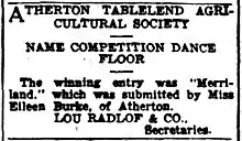 The Defence Canteen igloo was purchased by the Atherton Tableland Agricultural Society for a very low price after the war. When the Atherton Shire Hall, built in 1898, was destroyed by fire in 1948, the war-time igloo became a Community Centre. A committee was formed to manage the hall and they set about building a dance floor measuring 5,000 square feet with a further 2,000 square feet of galleries for seating. The £4,000 needed for this work was put up by the Atherton Shire Council, and money raised by the Atherton Choral Society and the Atherton Players. Both these groups put all their spare funds into improving the facilities, later adding chairs, stage lighting and dressing rooms. A contest was held to name the new Community Centre hall and Miss Eileen Burke won with the name "Merriland".[2] In July 1951, the committee gave a Grand Ball to celebrate the opening with over 1,200 people in attendance.[3] Merriland Hall went on to host most of the social and cultural occasions of Atherton for many years.[1]