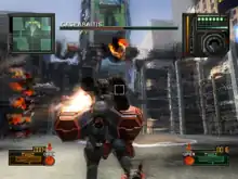 Metal Wolf Chaos is a third-person shooter.[1] The player takes on the role of Michael Wilson, the President of the United States, piloting an armored mech with a large arsenal of weapons, and must fight their way through destructible environments full of enemy infantry, tanks, and helicopters.[2][3] The goal of each mission is to destroy all enemies, sometimes within a time limit. Each stage also has optional goals of rescuing a set of hostages and collecting energy pods. Saving hostages unlocks musical tracks for the game and special weapons, while the energy pods give the player additional shields for protection from enemy attack.[3] The player can dash for quicker mobility, but excessive dashing will drain shield power.[3]