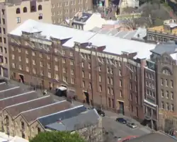 ![]() Metcalfe Bond Stores, viewed from the Sydney Harbour Bridge, in 2008. The road below is Hickson Road with Campbell's Stores pictured at left. | |