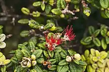 It is closely related to the widespread and highly variable ʻōhiʻa lehua (Metrosideros polymorpha), found throughout the islands. Lehua papa, however, is restricted to a narrow habitat range at the summits of very wet, windswept ridges and cliffs in the Koʻolau mountains.