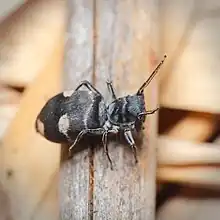 Like many jumping spiders, Wesołowska and Tamás Szűts noted that Mexcala spiders mimic ants.[11] The species lives amongst various different species of ant and ant-like wasps that it mimics, and preys upon.[9][12] Like other jumping spiders, it is a mainly diurnal hunter that uses its good eyesight to spot its prey.[13] It attacks from the front and captures its prey behind the head.[14] The chelicerae have short thick spines on them which may be used for digging holes to act as underground hiding places.[15] It uses visual displays during courtship and transmits vibratory signals through silk to communicate to other spiders.[16]