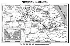 The Mexican Railway (Ferrocarril Mexicano) (reporting mark FCM) was one of the primary pre-nationalization railways of Mexico. Incorporated in London in September 1864 as the Imperial Mexican Railway (Ferrocarril Imperial Mexicano) to complete an earlier project, it was renamed in July 1867[1] after the Second French Empire withdrew from Mexico.