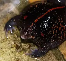 The Mexican burrowing toad (Rhinophrynus dorsalis) is the single living representative of the family Rhinophrynidae.[2] It is a unique species in its taxonomy and morphology, with special adaptations to assist them in digging burrows where they spend most of their time. These adaptations include a small pointed snout and face, keratinized structures and a lack of webbing on front limbs, and specialized tongue morphology to assist in feeding on ants and termites underground.[3] The body is nearly equal in width and length. It is a dark brown to black color with a red-orange stripe on its back along with splotches of color on its body. The generic name Rhinophrynus means 'nose-toad', from rhino- (ῥῑνο-), the combining form of the Ancient Greek rhis (ῥίς, 'nose') and phrunē (φρύνη, 'toad').[4]