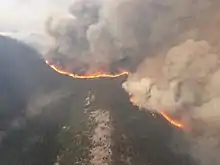 The Meyers Fire burned in Beaverhead-Deerlodge National Forest and Bitterroot National Forest in the U.S. state of Montana and was first reported on July 17, 2017 at 5:21pm. Located approximately 25 mi (40 km) southwest of Phillipsburg, Montana, the Meyers Fire is a natural fire that was caused by lightning. As of September 28, 2017, it encompassed 62,034 acres (25,104 ha).[1] The Meyers Fire originated after a lightning storm passed over the region, starting a fire in remote terrain in Granite County, Montana within Beaverhead-Deerlodge National Forest. The fire then burned into neighboring Ravalli County, Montana and then crossed the continental divide into Beaverhead County, Montana and Deer Lodge County, Montana, where it entered Bitterroot National Forest.[1] By August 3, the Meyers and Whetstone Fires merged, with the name of the former being the official name of the event.[2] Due to a heavy fuel load, exceptionally dry conditions with high heat and periods of strong winds, the Meyers Fire had periods of explosive growth during August and early September, leading to evacuations of nearby communities.[1]